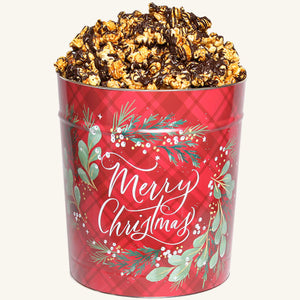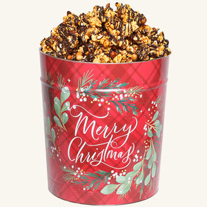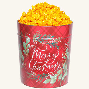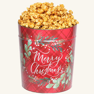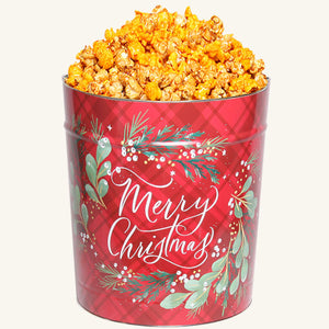 Tri Flavor 3.5 Gallon Christmas Plaid Tin-Caramel-Butter-Cheddar